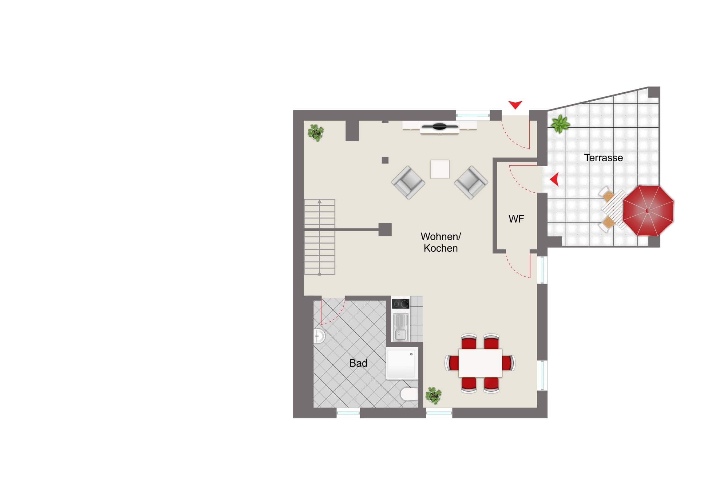 Der Zugang zur Wohnung erfolgt über einen separaten Eingang, der über einige Stufen erreichbar ist. Dadurch genießen die Bewohner zusätzliche Privatsphäre, da kein gemeinsamer Hausflur mit anderen Parteien genutzt werden muss.