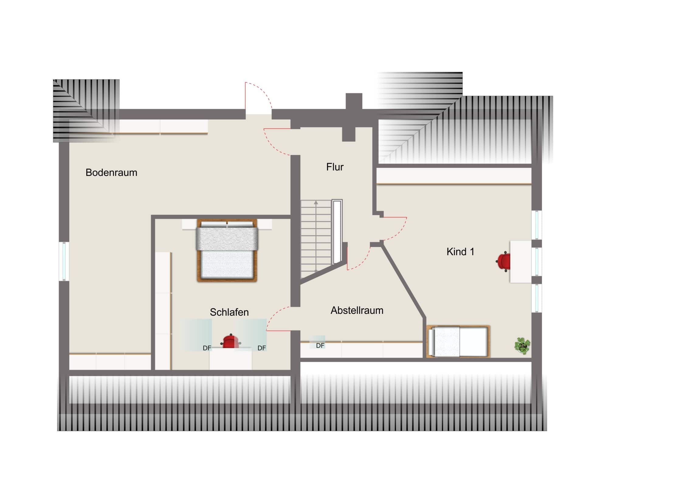 Im Dachgeschoss befinden sich ein helles Schlafzimmer, ein weiteres Zimmer (z. B. Kinder-, Gäste- oder Arbeitszimmer) sowie ein Abstellraum. Ein Teil des Dachbodens bietet zusätzliches Ausbaupotenzial.