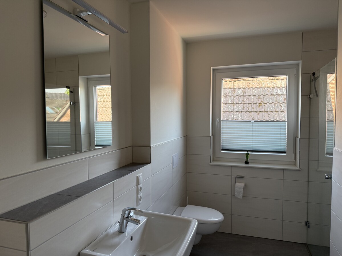 Das Tageslichtbadezimmer ist mit weißen, großformatigen Fliesen und gradlinigen Sanitärelementen ausgestattet.