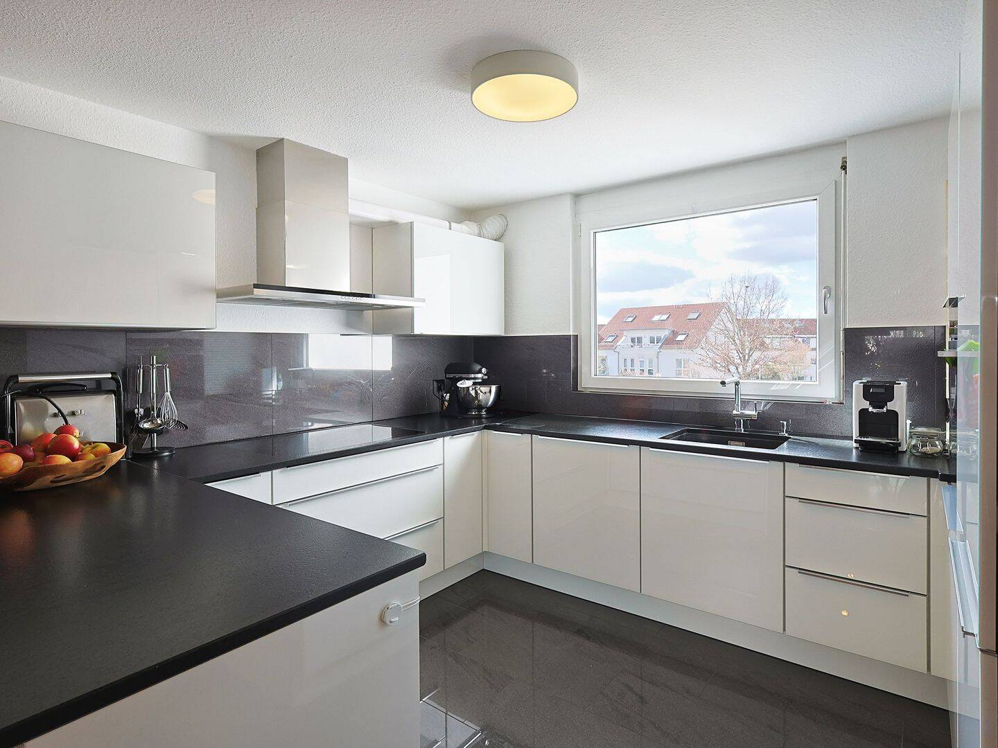 Offene, helle Küche mit Glasfronten, Natursteinarbeitsplatte und elektr. Großgeräten - Etagenwohnung mit 110,00 m² in Schwieberdingen zum Kaufen