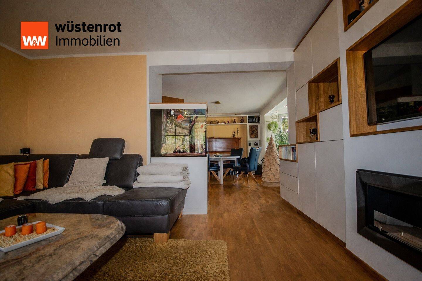 • modernes Wohnzimmer mit Esstisch und Aquarium -