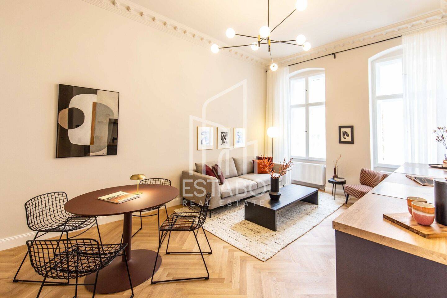 Offener Wohn- und Essbereich - Altbauschmuckstück in Mitte - hochwertig sanierte 2-Zimmer Wohnung mit 2 Bädern und 3,6 m Deckenhöhe
