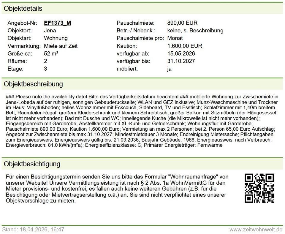 Sie befinden sich hier: Möblierte 2-Raum-Wohnung in Jena mit Balkon zur Zwischenmiete in Jena Lobeda-Altstadt - 3385323471-203-3774 | 1A-Immobilienmarkt.de