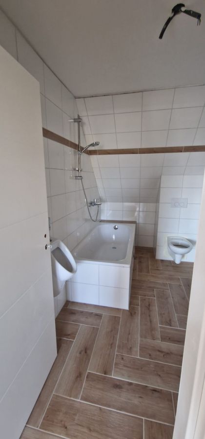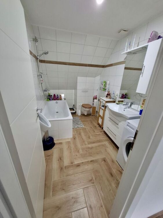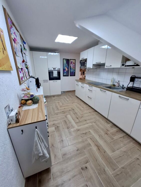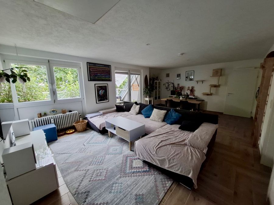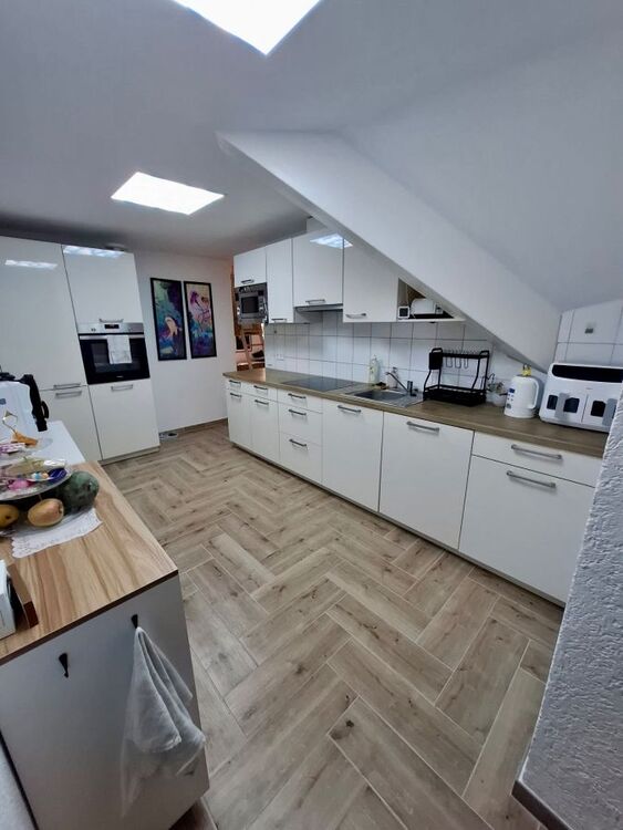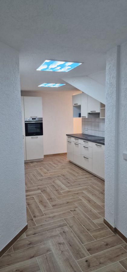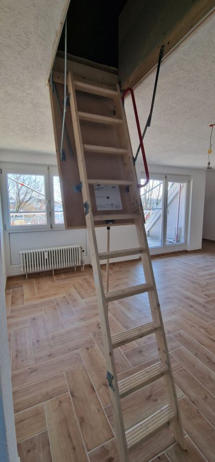Um in die Wohnung zu gelangen, fahren Sie mit dem Lift direkt per Schlüssel in den obersten Stock eines Mehrfamilienhauses. Sie betreten zuerst einen privaten Flur, der nur für Bewohner des obersten Stocks mittels Liftschlüssel zu erreichen ist. Die Lage der Wohnung ist bestens im neuen Zentrum von Grenzach-Wyhlen gelegen unweit der Grenze, diversen Einkaufsläden, Bahnhof, Busstation (mit Verbindung direkt nach Basel), Restaurants, Banken und allen Geschäften des täglichen Bedarfs. Über eine extrabreite Eingangstür und Flur betreten Sie die komplett neu sanierte und renovierte Dachgeschosswohnung mitsamt einem Zugang zum Dachspeicher vom Wohnzimmer aus!!! Nach betreten der Wohnung befindet sich gleich rechter Hand Platz für die Garderobe sowie geradeaus ein GästeWC. Wenn Sie Links gehen, gelangen Sie in die geräumige Küche sogar mit Platz für einen Tisch bis 4 Personen. Von der Küche aus kommen Sie direkt ins offene grosse Wohnzimmer incl. der Treppe, welche Sie in den ca. 35 m2 Grundfläche Dachspeicher führt. Vom Wohnzimmer rechter Hand betreten Sie das Bad mit Toilette, Pissoir, Waschbecken, Badewanne und Waschmaschinenplatz. Das Bad besitzt einen Lüfter. Ebenfalls vom Wohnzimmer erreichen Sie den ca. 12m2 grossen Balkon und das kleinere ca. 16m2 grosse Schlafzimmer sowie das XL Schlafzimmer mit Dachschräge und einer Grundfläche von ca. 38m2!!! Insgesamt ist die Wohnung durch ihre Grösse und die teils grossen Zimmer sehr freizügig und modern gestaltet. Der gesamte Boden ist überall neu mit Fliessen in heller freundlicher Holzoptik belegt. Die Dachschrägenfenster im grossen Schlafzimmer sind allesamt 3-fach Verglast und besitzen Solar Rolladen.