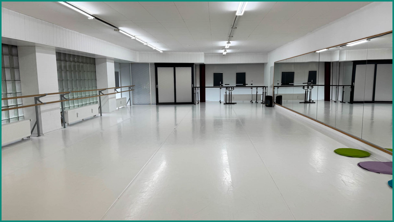 Die Räumlichkeiten der Tanzschule sind durchweg modern und hell ausgestattet. Die Tanzschule verfügt über einen eigenen Eingang. Am Anfang des Eingangs befindet sich ein Empfang. Die Böden sind im vorderen Bereich mit einem modernen hellen Laminat ausgelegt. Der hintere Bereich, hier befindet sich eine kleine Küche bzw. Bar mit Ausschank, ist mit einem hellen Teppich ausgelegt. Links gelangen die Tanzschüler und Schülerinnen in einen großen, durch zahlreiche Lampen sehr gut ausgeleuchteten Tanzsaal, ausgelegt mit einem speziellen weißen Kunststoffboden. Die rechte Wand ist übe die gesamte Länge mit Spiegel ausgestattet, die rechte Seite mit Glasbausteinen, die ausreichend viel Tageslicht hereinlassen. Nebenan befindet sich ein Fitnessraum, der...