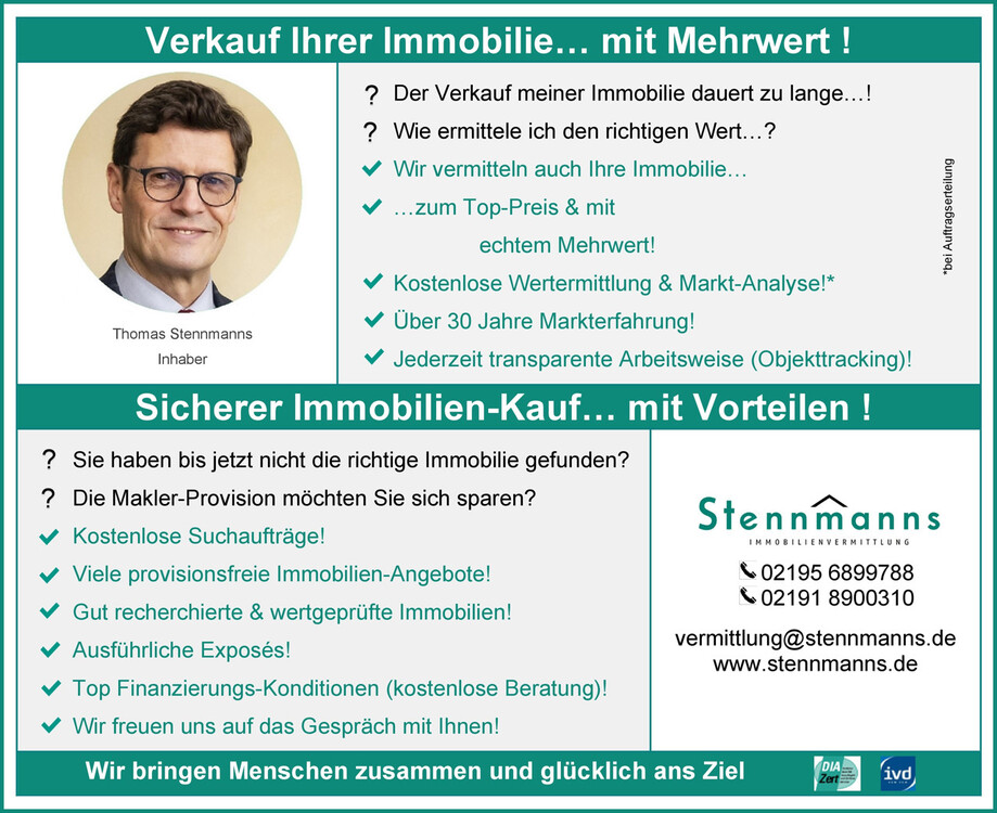 Verkäufer-Service: Sie möchten gerne Ihre Immobilie verkaufen, die Vermarktung aber nicht selbst abwickeln, sondern einen Profi-Makler mit der Vermittlung beauftragen? Dann würden wir uns über Ihre Kontaktaufnahme unter 02195-6899788 oder unter vermittlung@stennmanns.de sehr freuen. Im unverbindlichen Erstgespräch zeigen wir Ihnen gerne den Mehrwert und Ihre Vorteile auf, die Sie mit der Beauftragung von Stennmanns Immobilienvermittlung erhalten.