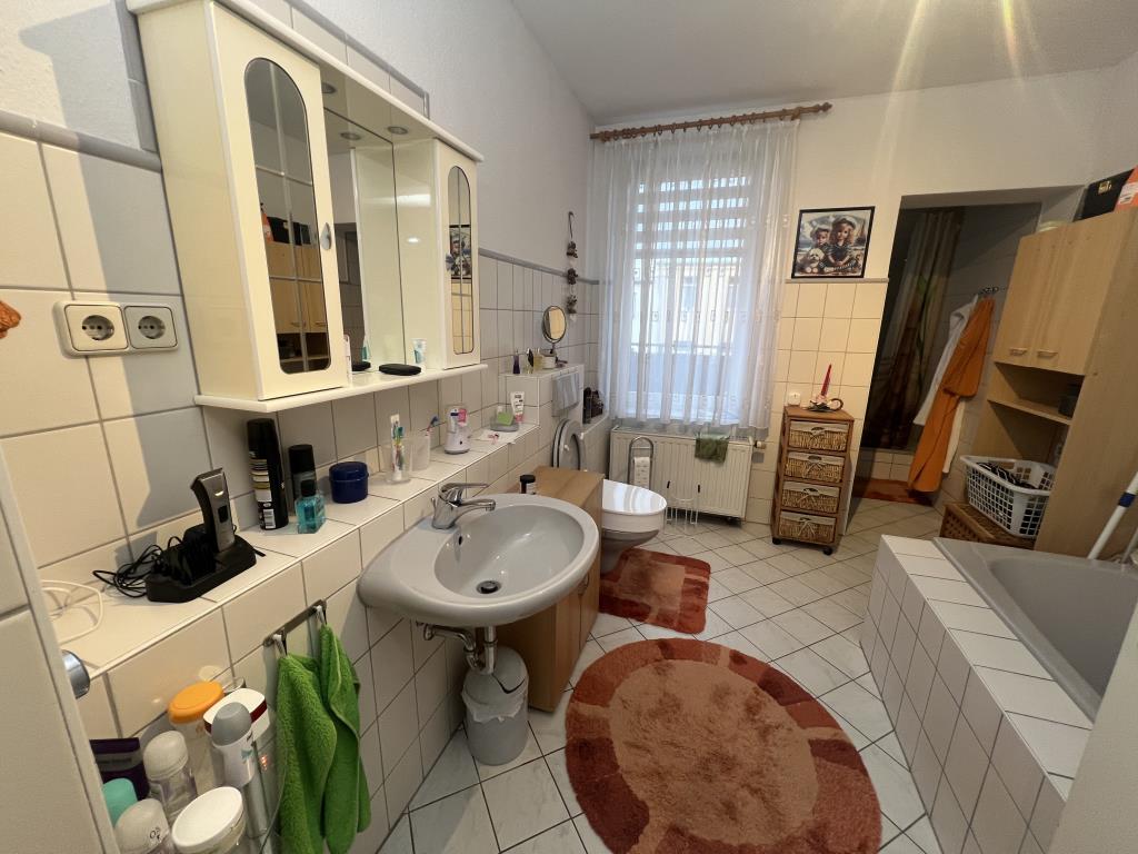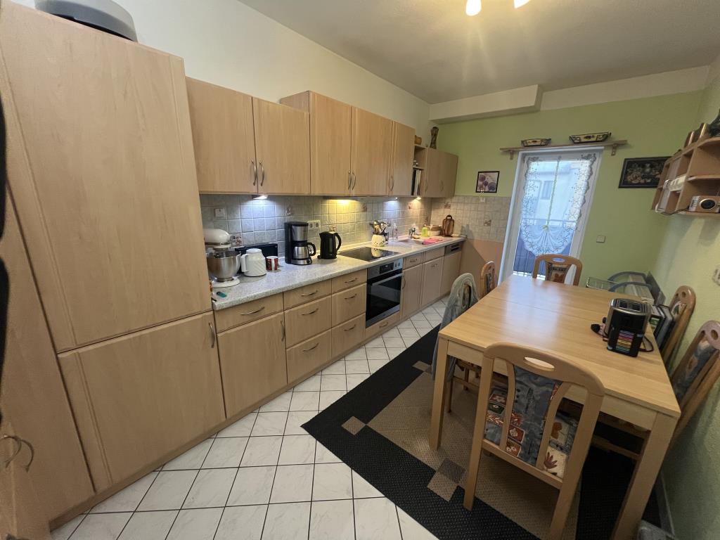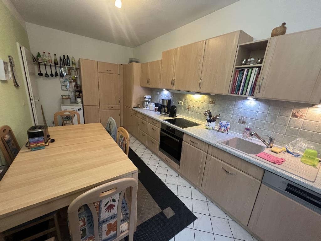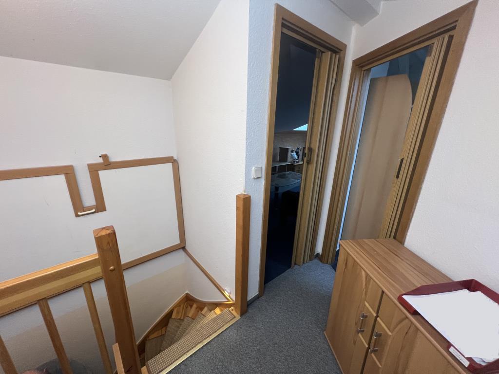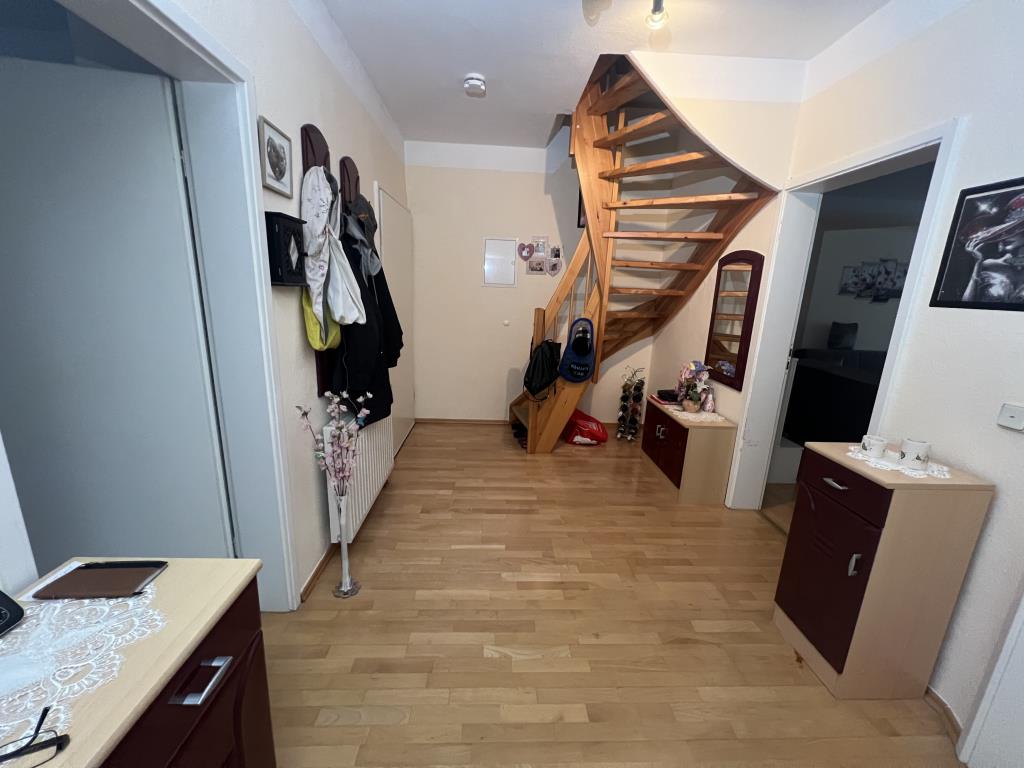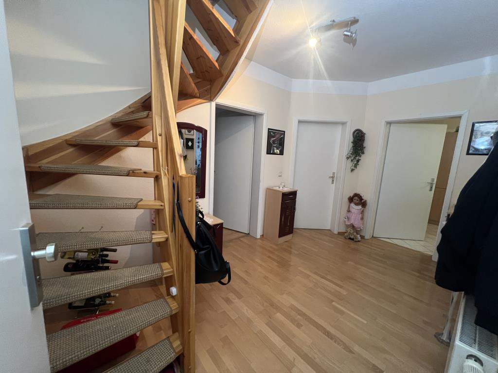 * großer Balkon * Wohn-, Schlafzimmer und Flur: Laminatboden * Bad mit Wanne und Dusche, Fliesenspiegel und Bodenfliesen * große Küche mit Zugang zu dem Balkon, Fliesenspiegel und Bodenfliesen * Einbauküche kann durch Ablöse vom Vormieter übernommen werden * über eine Wendeltreppe gelangt man in das Kinderzimmer/Büro mit Teppichbelag. Bei Bedarf besteht die Möglichkeit das Zimmer zu trennen um so 2 Räume zu schaffen. * Klingel mit Wechselsprechanlage * Kelleranteil * Waschmaschinenraum im Keller * PKW-Stellplätze befinden sich vor dem Haus bzw. öffentliche Stellplätze in unmittelbarer Nähe