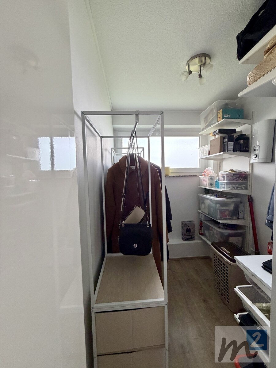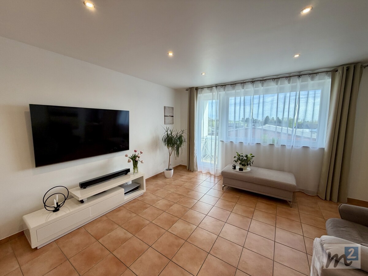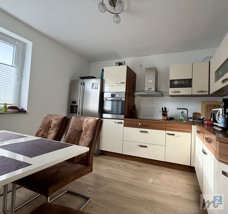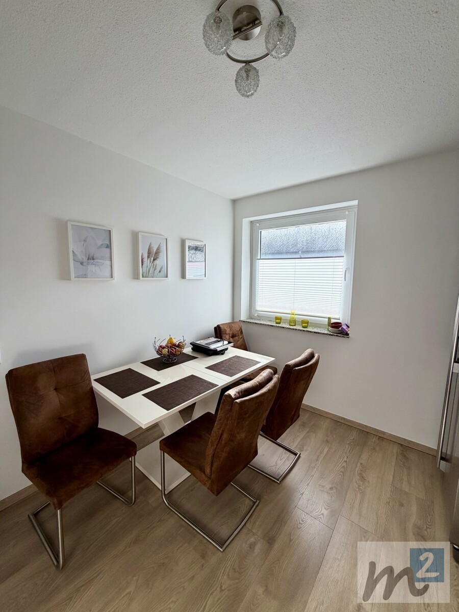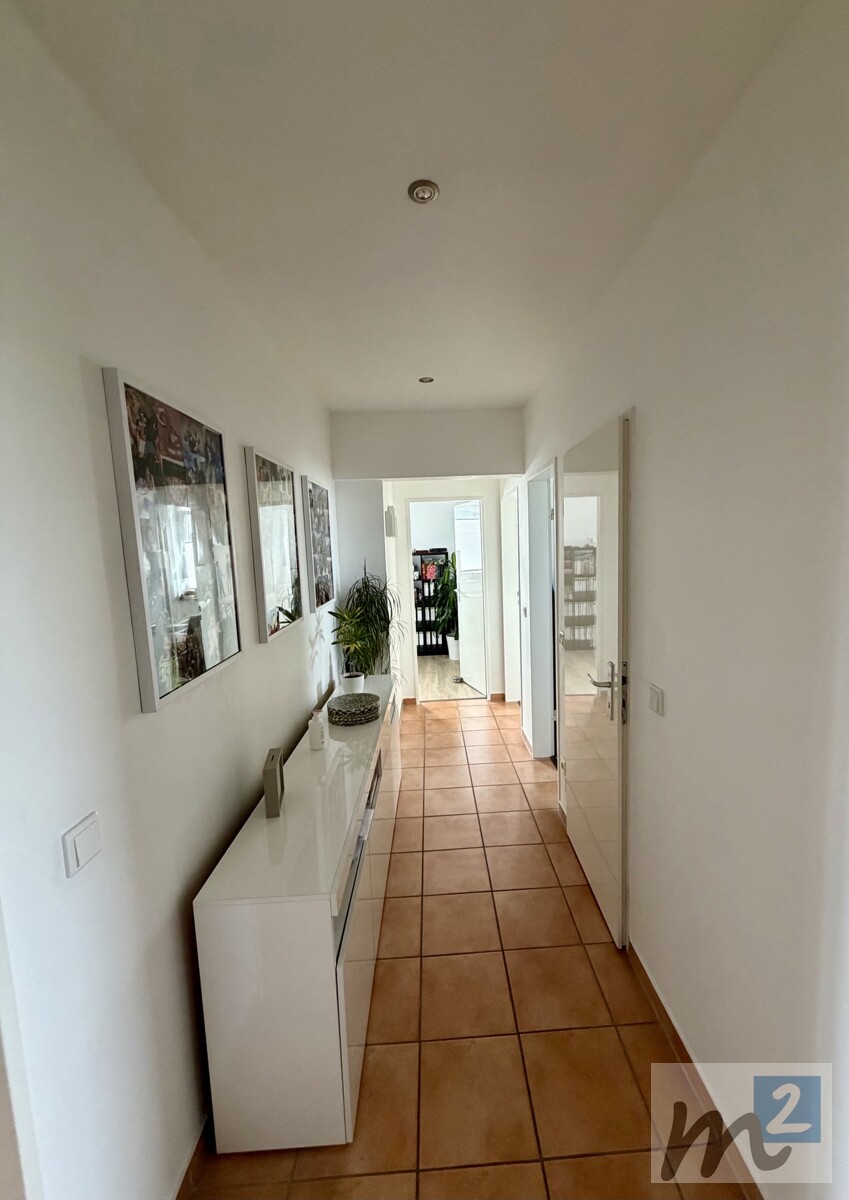 Die Decken der Räume (außer Küche und Ankleide-/Abstellraum) sind mit Halogenleuchten ausgestattet, die für eine angenehme Beleuchtung in der Wohnung sorgen. Das Schlafzimmer, das Kinderzimmer, die Küche und der Ankleide-/Abstellraum haben wohnliche Laminatböden, und in den restlichen Zimmern sind Fliesenböden vorhanden.