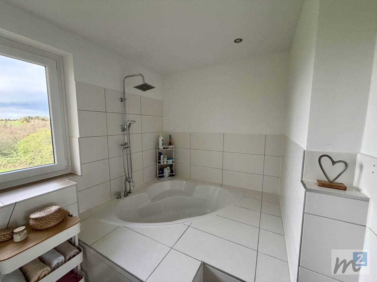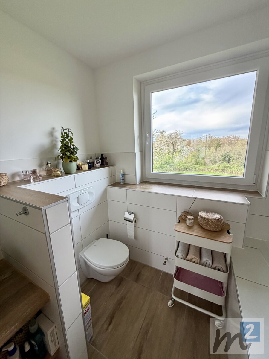 Das große und moderne Tageslicht-Badezimmer ist mit einem Waschbecken, einem WC und einer schönen großen Eck-Badewanne ausgestattet. Helle Wandfliesen sowie Bodenfliesen in Laminatoptik - und der Ausblick durch das Fenster ins Grüne - sorgen für eine freundliche Wohlfühl-Atmosphäre im Bad. Außerdem befindet sich ein praktischer abgeteilter Stellplatzbereich für die Waschmaschine im Bad.