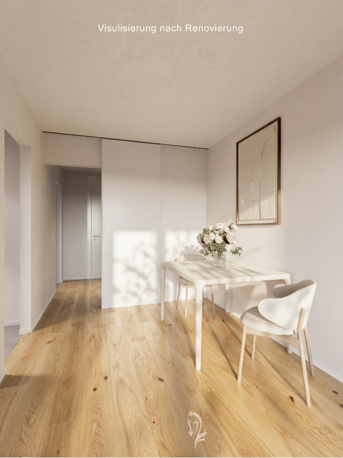 Aus Rücksicht auf die Privatsphäre des aktuellen Mieters verzichten wir auf aktuelle Innenaufnahmen der Wohnung. Die vorhandenen älteren Fotos liegen nur in einem eingeschränkter Ausschnitt vor. Ergänzend zeigen wir daher Visualisierungen, die eine mögliche moderne Gestaltung nach einer Renovierung der Räume beispielhaft veranschaulichen.