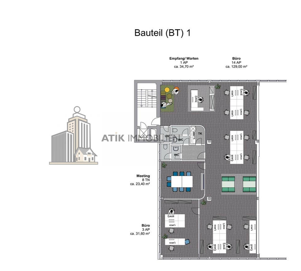 Darunter befinden sich im 3. Obergeschoss des BT3 Büroflächen mit 420 m², im 2. Obergeschoss ebenfalls im BT3 Büroflächen mit 1.110 m² sowie im 1. Obergeschoss des BT1 Büroflächen mit 585 m² - alle Flächen sind sofort bezugsfertig. Die Mietpreise liegen zwischen 8, 50 € und 13, 00 € pro Quadratmeter.
