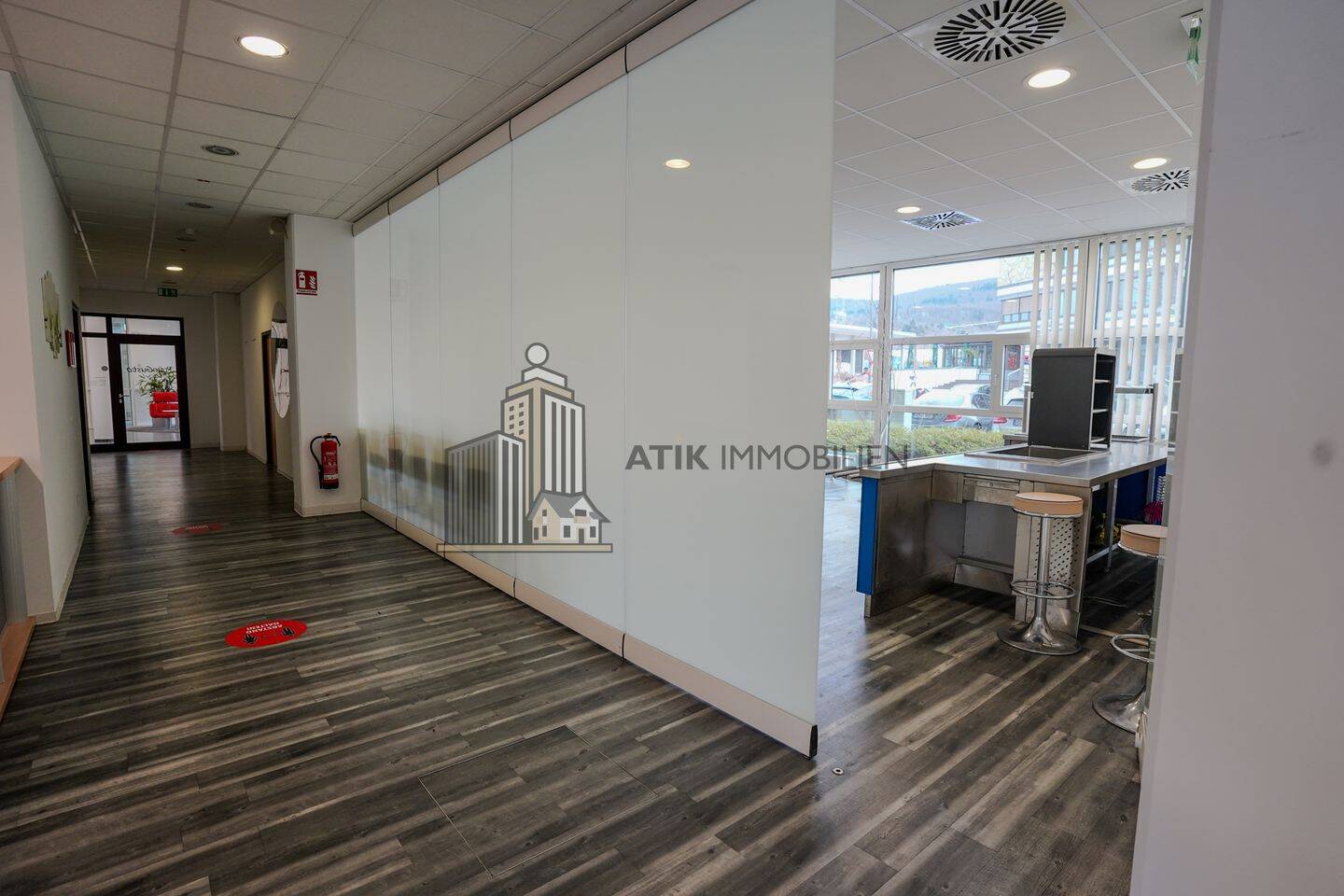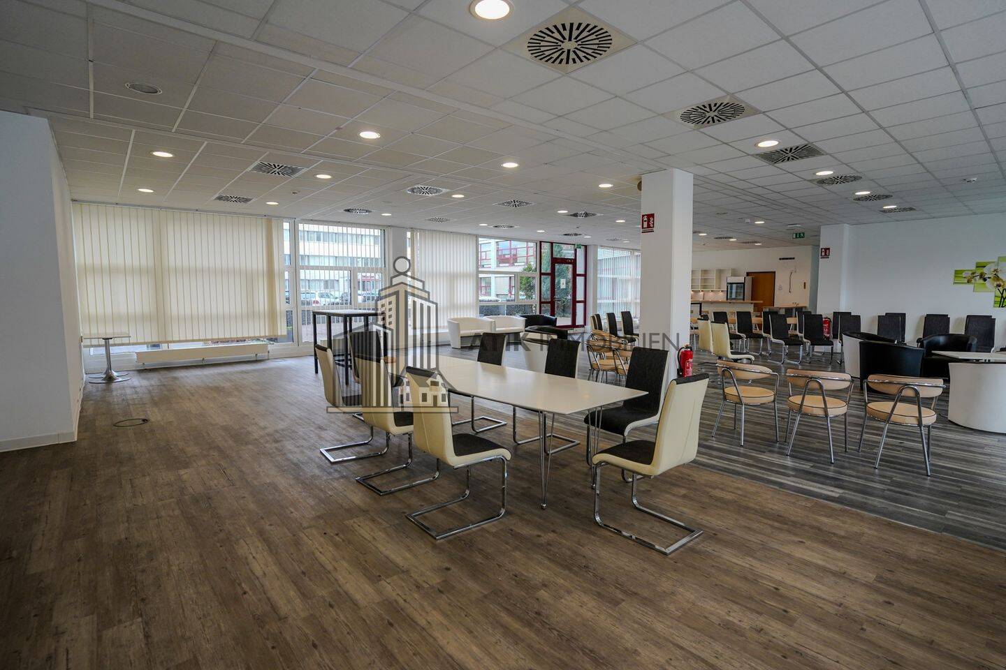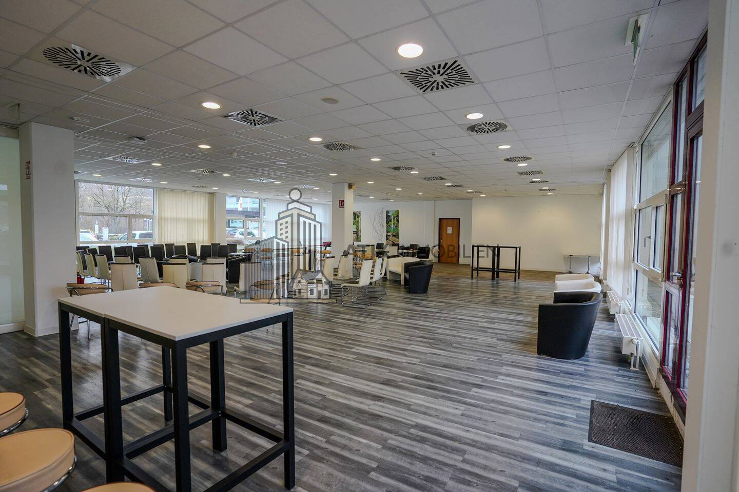 Im Erdgeschoss des Gebäudes erwartet Sie eine großzügige Gewerbefläche von ca. 427 m², die früher als Kantine genutzt wurde. Diese attraktive Fläche bietet eine ideale Grundlage für eine Vielzahl an Nutzungsmöglichkeiten und kann flexibel an die individuellen Bedürfnisse Ihres Unternehmens angepasst werden. Ob als Büroflächen, Showroom oder Gastronomiebereich - die vorhandene Ausstattung lässt sich nach Ihren Vorstellungen umgestalten.