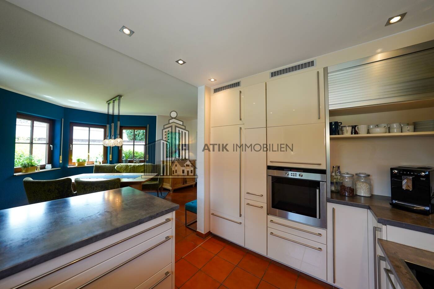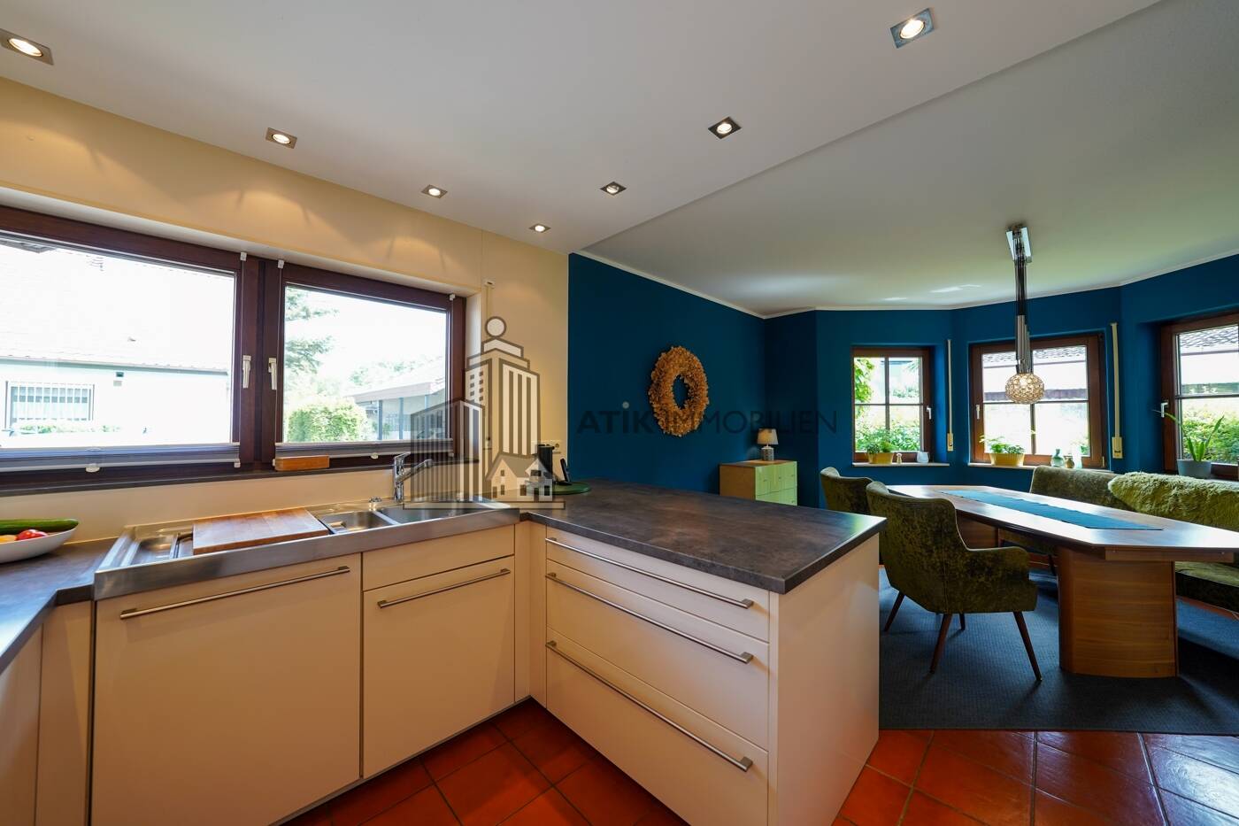 Der offen gestaltete Essbereich geht fließend in den Wohnbereich über und entfaltet sich ebenso zu einem repräsentativen Mittelpunkt des Hauses, ein Ort der Begegnung, an dem stilvolle Geselligkeit und familiäre Nähe auf harmonische Weise zusammenfinden. Die fließenden Übergänge zwischen Wohn-, Ess- und Küchenbereich verleihen dem Erdgeschoss eine angenehme Tiefe und ein großzügiges Raumgefühl, das sowohl Raum für Geselligkeit als auch für entspannte Rückzugsorte bietet.