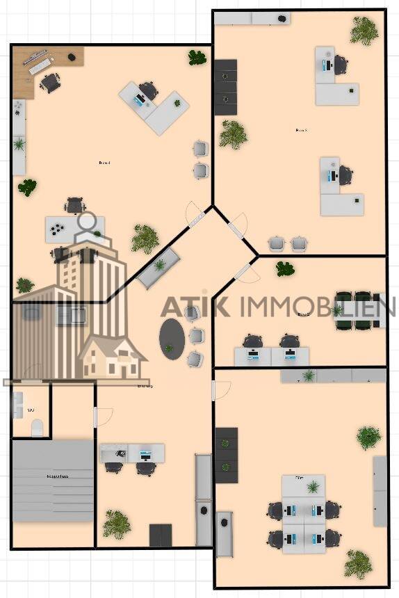 Die Bürofläche ist optimal geschnitten und besteht aus fünf separaten Büros, die flexibel genutzt werden können. Der Empfangsbereich ist großzügig gestaltet und könnte auf Wunsch in zusätzliche Büroräume oder einen Konferenzraum unterteilt werden. Ein praktischer Server-/Archivraum ergänzt das Angebot.