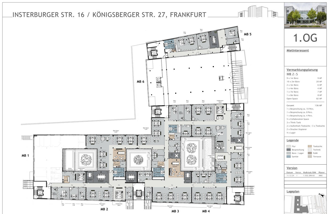 Im 3. Obergeschoss befinden sich zwei Büroflächen mit ca. 717 m² sowie ca. 688 m², jeweils mit zugehöriger Terrassenfläche. Im 1. Obergeschoss steht eine weitere Einheit mit ca. 323 m² zur Verfügung. Zusätzlich sind im Erdgeschoss fünf vakante Büroflächen ab ca. 323 - 995 m² verfügbar.
