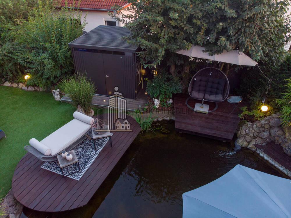 Das wahre Glanzstück zeigt sich im Außenbereich: eine Gartenlandschaft, die an ein exklusives Boutique-Resort erinnert. Die überdachte Terrasse lädt zu entspannten Sommerabenden ein, während der idyllische Schwimmteich mit Außendusche und Lounge-Bereich pure Erholung verspricht. Darüber hinaus bietet der Garten Platz für eine Outdoor-Küche oder weitere Gestaltungsideen; ein Ort, an dem Wohnen und Urlaub verschmelzen.