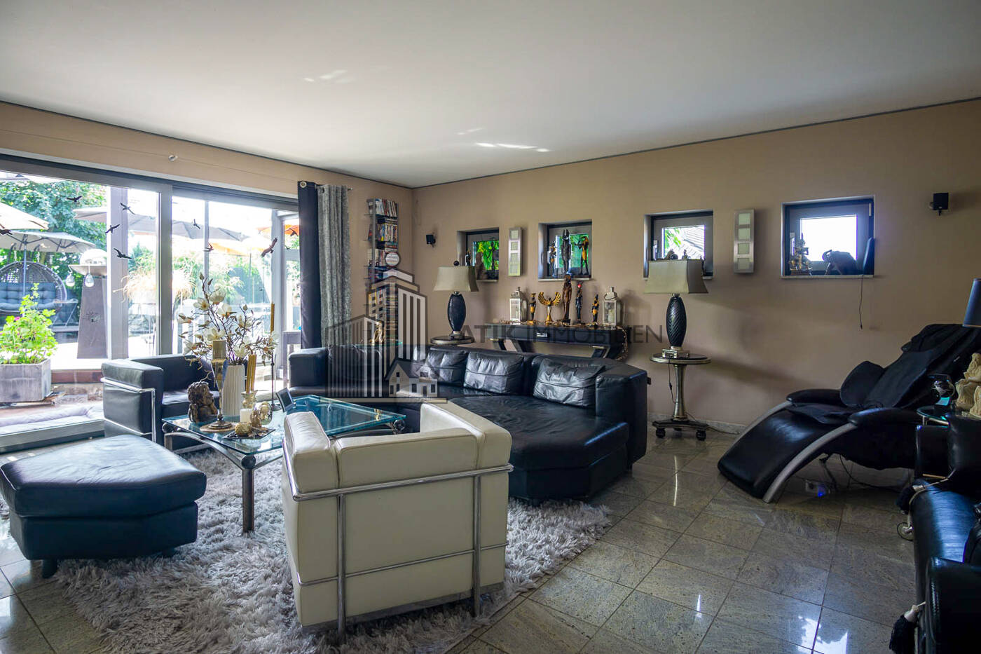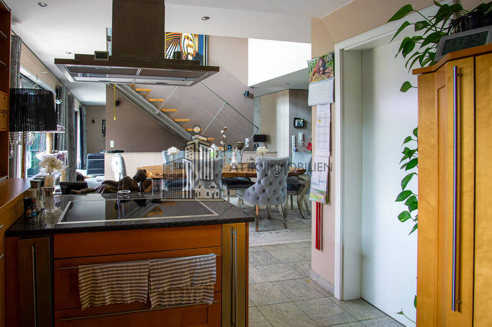 Schon beim Eintreten beeindruckt das offene Raumkonzept mit lichter Raumhöhe und einer eleganten Galerie, die den Blick über den Essbereich freigibt. Ein architektonischer Blickfang, der Transparenz, Weite und natürliches Licht harmonisch vereint. Fließende Übergänge zwischen den Ebenen verleihen dem Interieur repräsentative Leichtigkeit und unterstreichen den hohen Anspruch an Wohnkomfort. Großzügige Fensterflächen und bodentiefe Glasfronten durchfluten die Hauptbereiche mit Tageslicht und öffnen den Blick zur Terrasse und in den Garten.