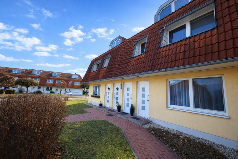 Hausansicht - Terrasse & Stellplatz. Klar geschnitten.