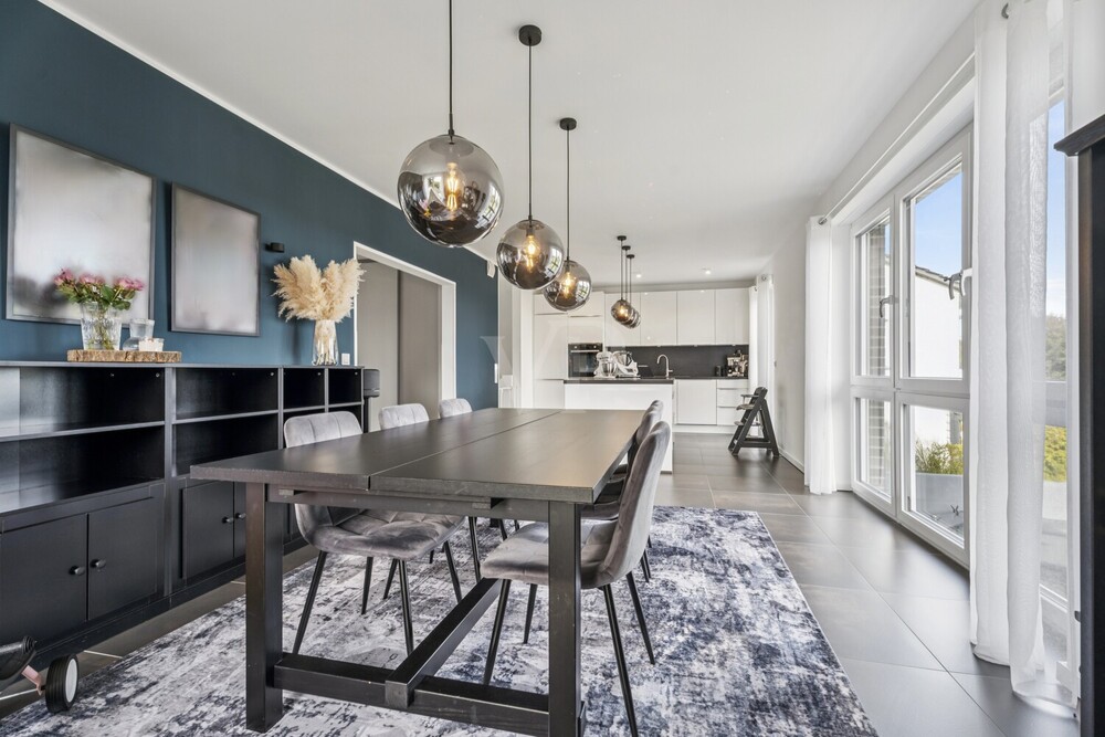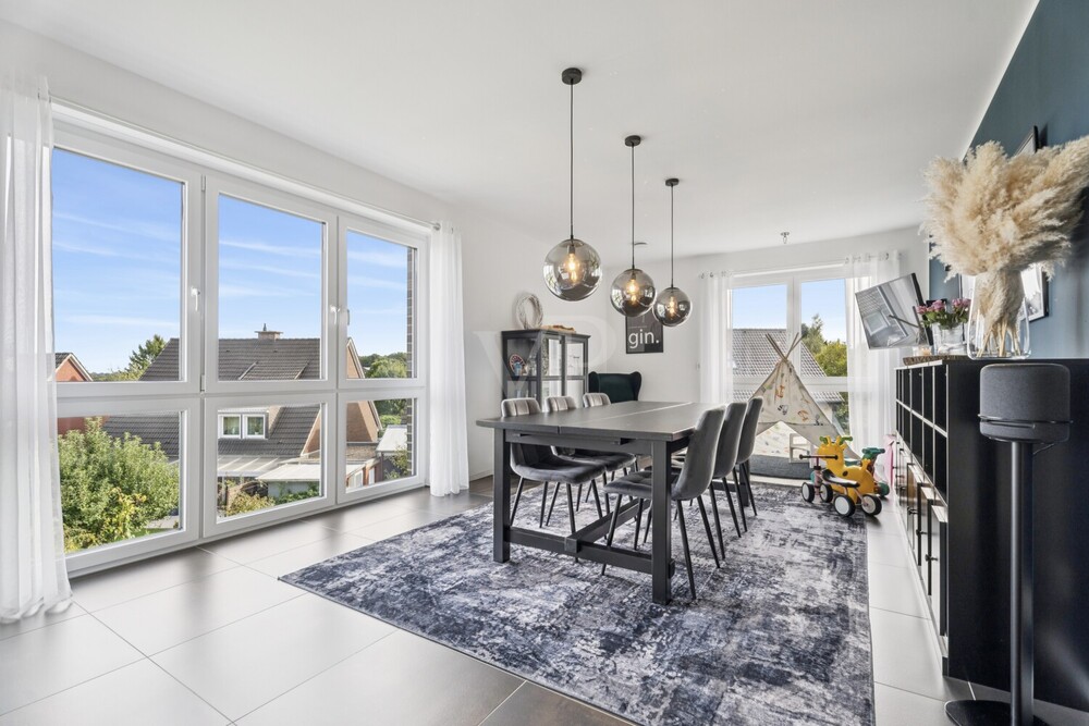 Im Mittelpunkt steht die Wohnküche mit Einbauküche und Kochinsel. Große, bodentiefe Fenster sorgen für viel Tageslicht und bieten einen Blick ins Grüne. Der Essbereich bildet einen zentralen Treffpunkt für Familie und Gäste.