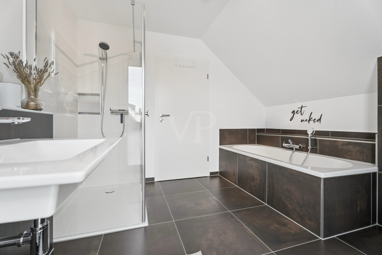 Das Dachgeschoss umfasst drei Schlafzimmer, darunter ein Elternschlafzimmer mit Ankleide. Das Tageslichtbad ist mit bodengleicher Dusche und Badewanne ausgestattet und bietet modernen Komfort.