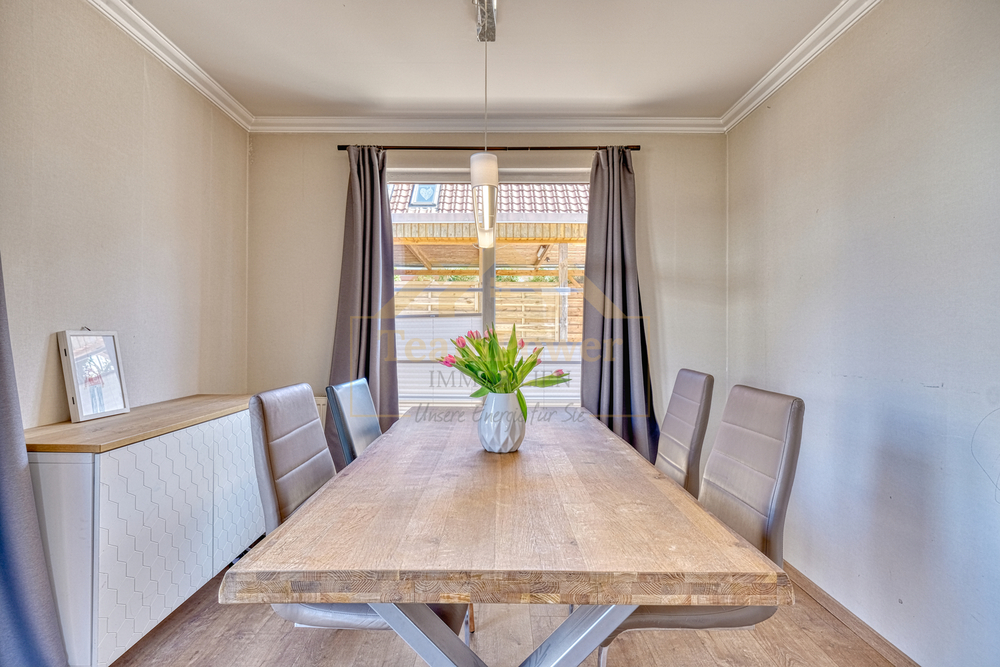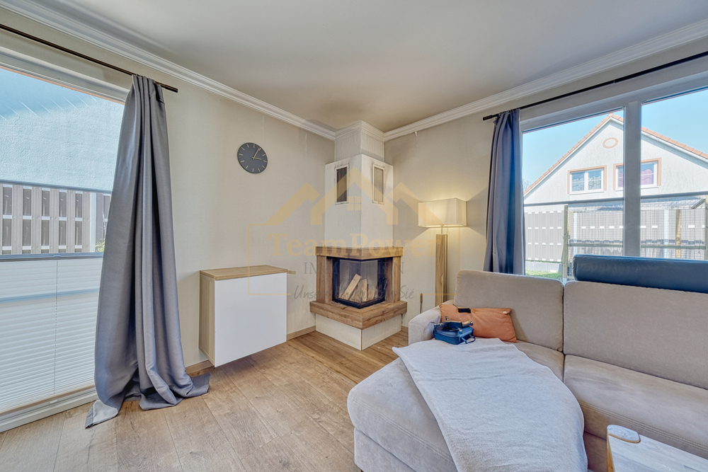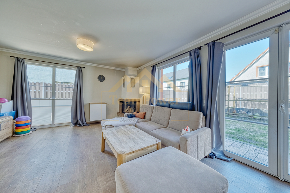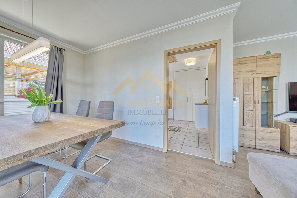 Bereits beim Betreten des Hauses empfängt Sie ein heller Eingangsbereich, der in den großzügigen Wohn- und Essbereich übergeht. Große Fensterflächen sorgen hier für viel Tageslicht und schaffen eine freundliche Atmosphäre. Der vorhandene Kamin unterstreicht den Wohnkomfort und lädt besonders in den kühleren Monaten zu gemütlichen Stunden ein. Von hier aus gelangen Sie direkt auf die sonnige Terrasse sowie in den liebevoll angelegten Garten – ein idealer Ort zum Entspannen und Verweilen im Freien.