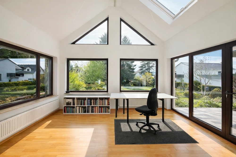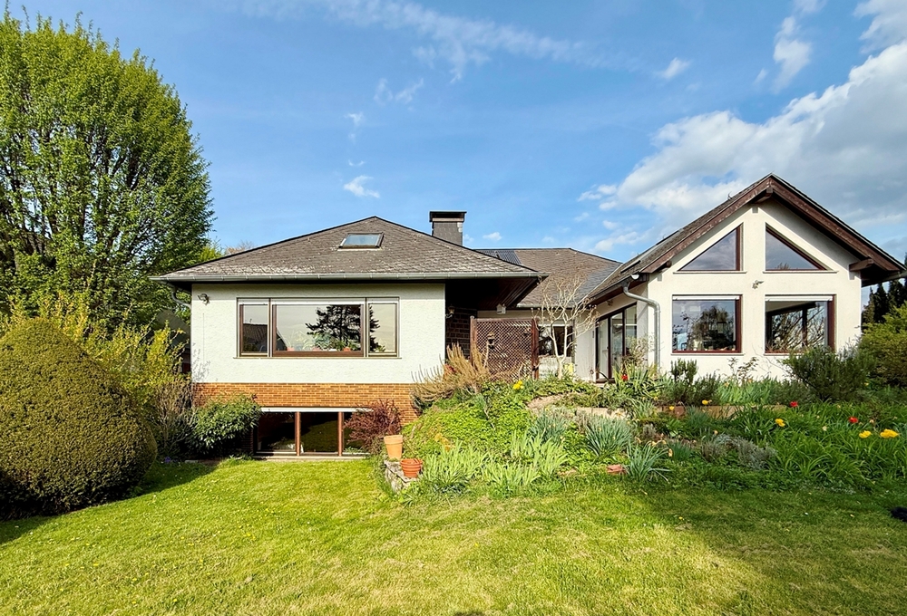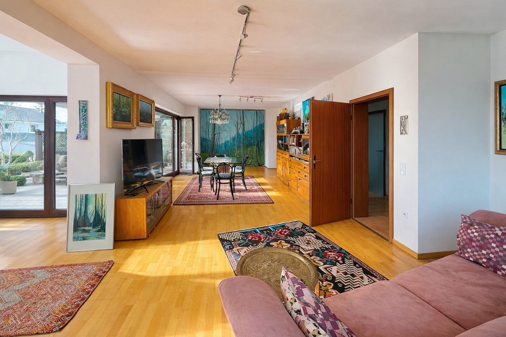 Das im Jahr 1979 errichtete Einfamilienhaus bietet rund 235 m² wohnlich nutzbare Fläche sowie zusätzliche Nutzflächen im Kellergeschoss. Bereits beim Betreten wird die Großzügigkeit und Flexibilität der Raumstruktur deutlich. Im Erdgeschoss stehen zwei weitläufige Wohnbereiche, ein beeindruckendes Atelier mit besonderer Atmosphäre sowie zwei Schlafzimmer zur Verfügung.