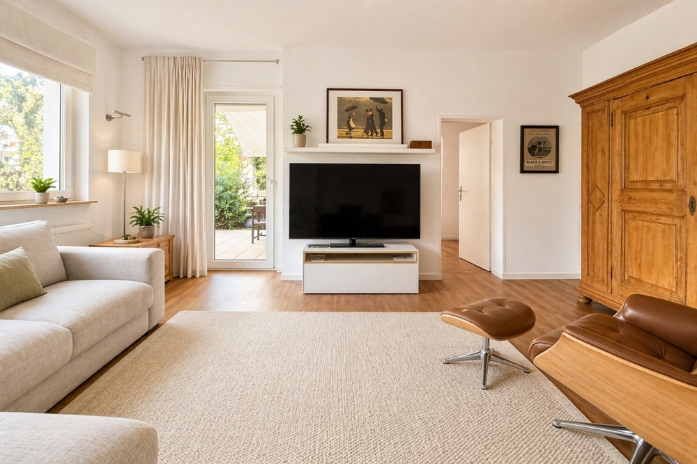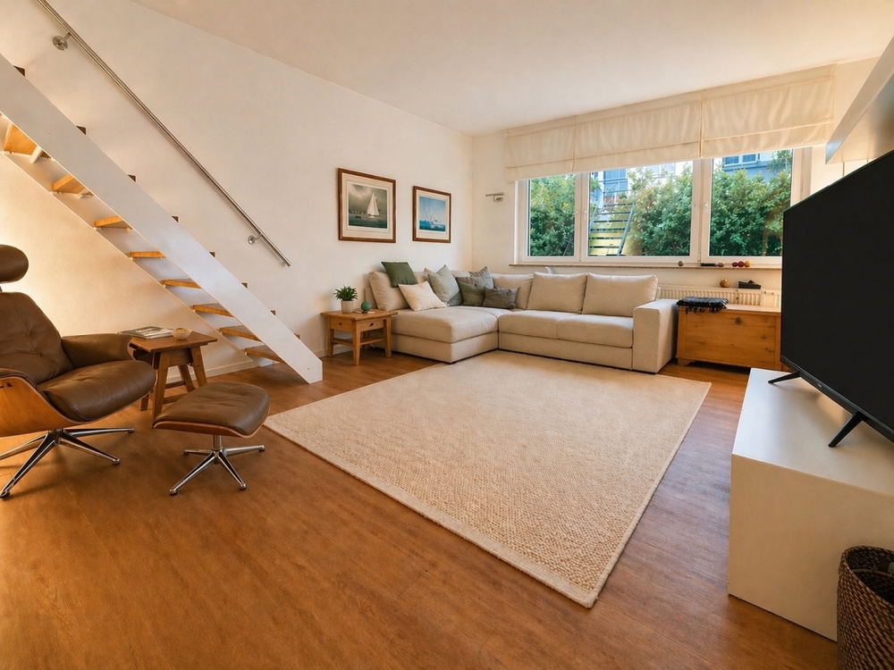 Auch im Innenbereich überzeugt die Immobilie durch eine hochwertige Ausstattung: Sämtliche Wohnräume im Gartengeschoss und im Erdgeschoss sind mit modernem Designbelag in ansprechender Holzdielenoptik ausgestattet, während im Obergeschoss klassische Holzdielenböden eine warme und wohnliche Atmosphäre schaffen. Zusätzlich sind die beiden Schlafräume im Obergeschoss klimatisiert und sorgen auch an heißen Tagen für ein angenehmes Raumklima.