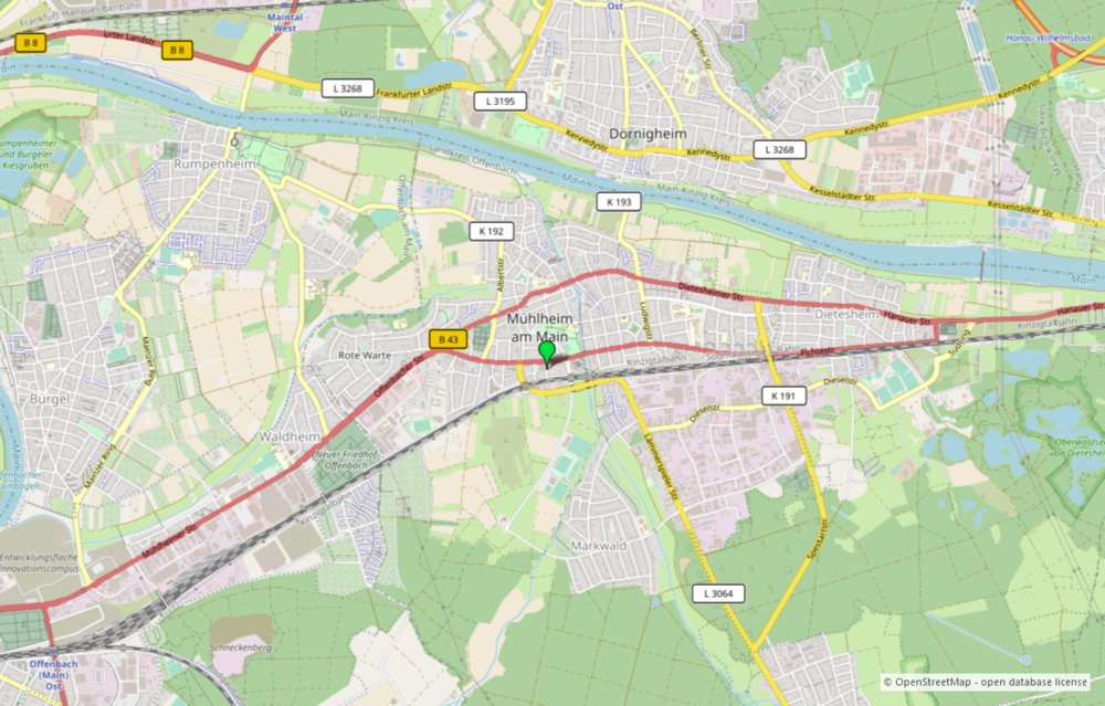Mühlheim am Main liegt idyllisch am südwestlichen Ufer des Mains und bietet als Teil des Rhein-Main-Gebiets kurze Wege nach Offenbach, Frankfurt und Hanau. Über die S-Bahn-Linien S8 und S9 erreichen Sie Frankfurt in ca. 20 Minuten, Offenbach in 5 Minuten und den Flughafen in rund 35 Minuten. Ergänzend bestehen gute Bus- und Straßenanbindungen über die B43. Die Stadt verfügt über eine sehr gute Infrastruktur mit vielfältigen Einkaufsmöglichkeiten, Wochenmärkten, Restaurants sowie Ärzten und Apotheken. Familien profitieren von einem breiten Angebot an Kindergärten, Grundschulen und weiterführenden Schulen direkt vor Ort. Für Erholung sorgen das Naturschutzgebiet Dietesheimer Steinbrüche, das Schutzgebiet Mayengewann sowie zahlreiche Grünflächen entlang von Main, Bieber und Rodau.