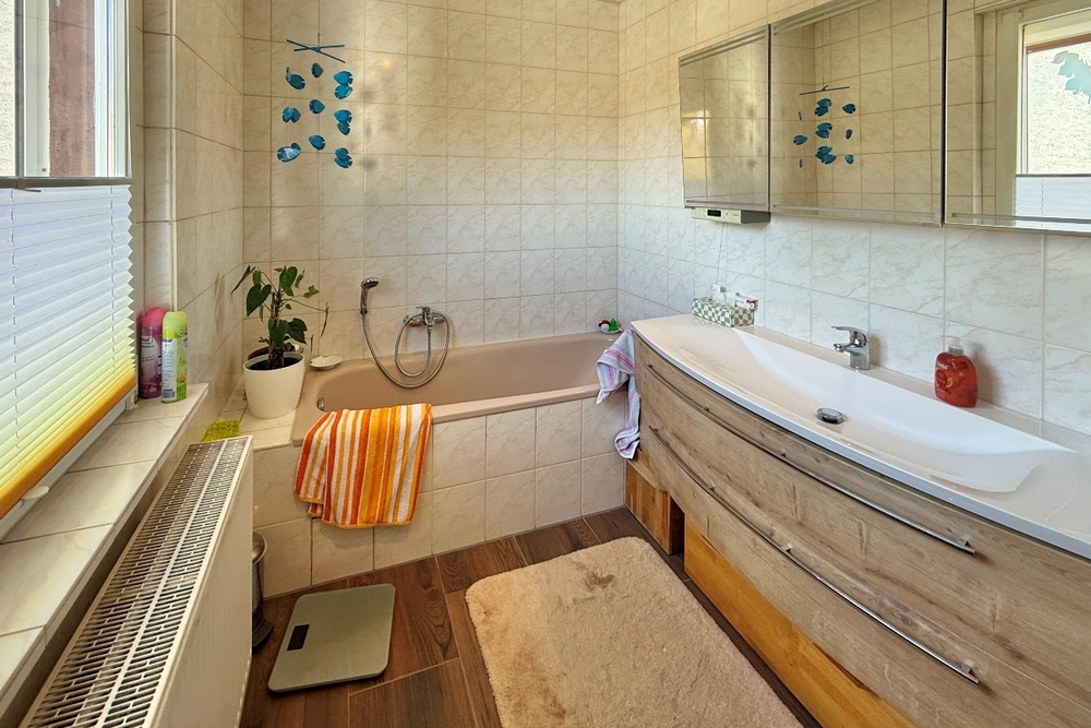Im Obergeschoss stehen ein großes Schlafzimmer mit integrierter Ankleide sowie ein modernes Tageslichtbad zur Verfügung. Das Badezimmer ist hochwertig ausgestattet und verfügt sowohl über eine Dusche als auch eine Badewanne.